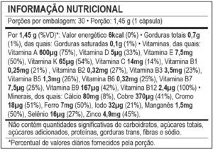Ingredientes: Óleo de soja, água purificada, fumarato ferroso, bisglicinato de zinco, ascorbato de cálcio, acetato de DL-alfa-tocoferol, bisglicinato de manganês, nicotinamida, L-selenometionina, palmitato de retinol, D-pantotenato de cálcio, bisglicinato de cobre, cloridrato de piridoxina, riboflavina, tiamina mononitrato, picolinato de cromo, ácido fólico, fitomenadiona, iodeto de potássio, D-biotina, colecalciferol, cianocobalamina, gelificante gelatina, estabilizantes carbonato de cálcio e cera de abelha, umectante glicerol, emulsificante lecitina e corantes óxido de ferro vermelho, óxido de ferro preto, carmins e azorrubina.