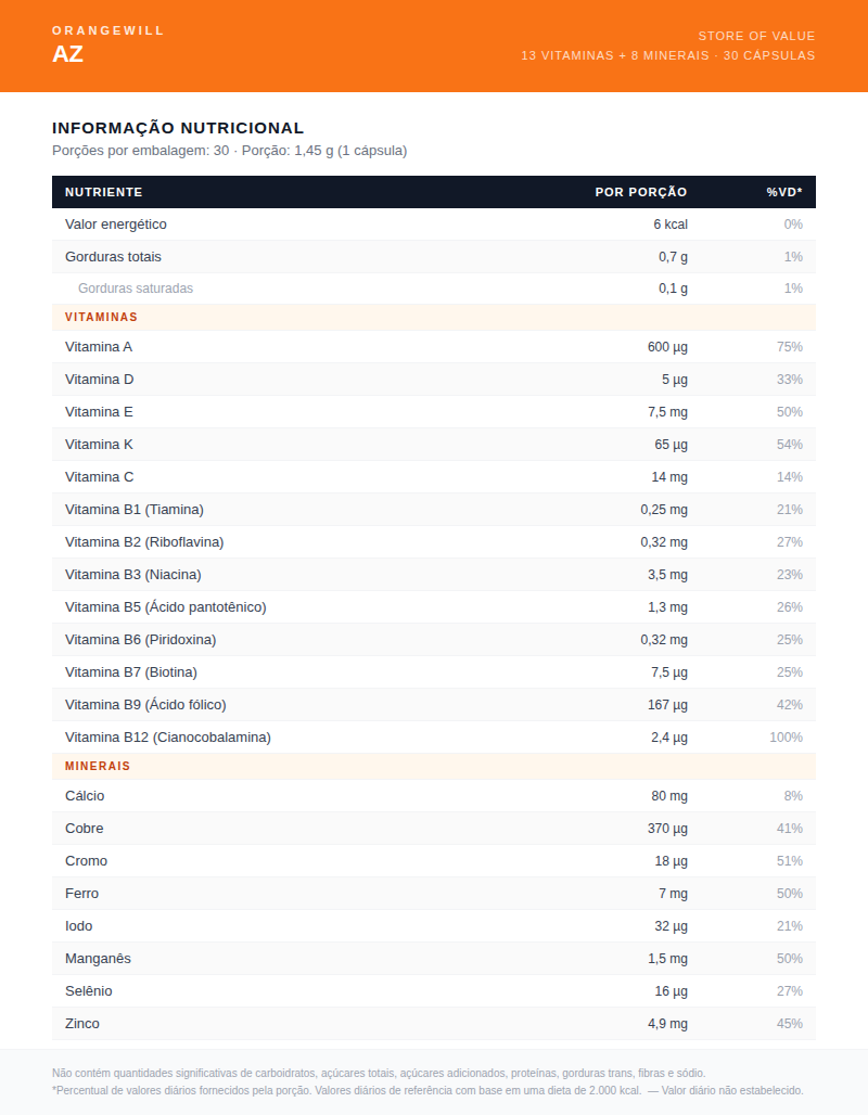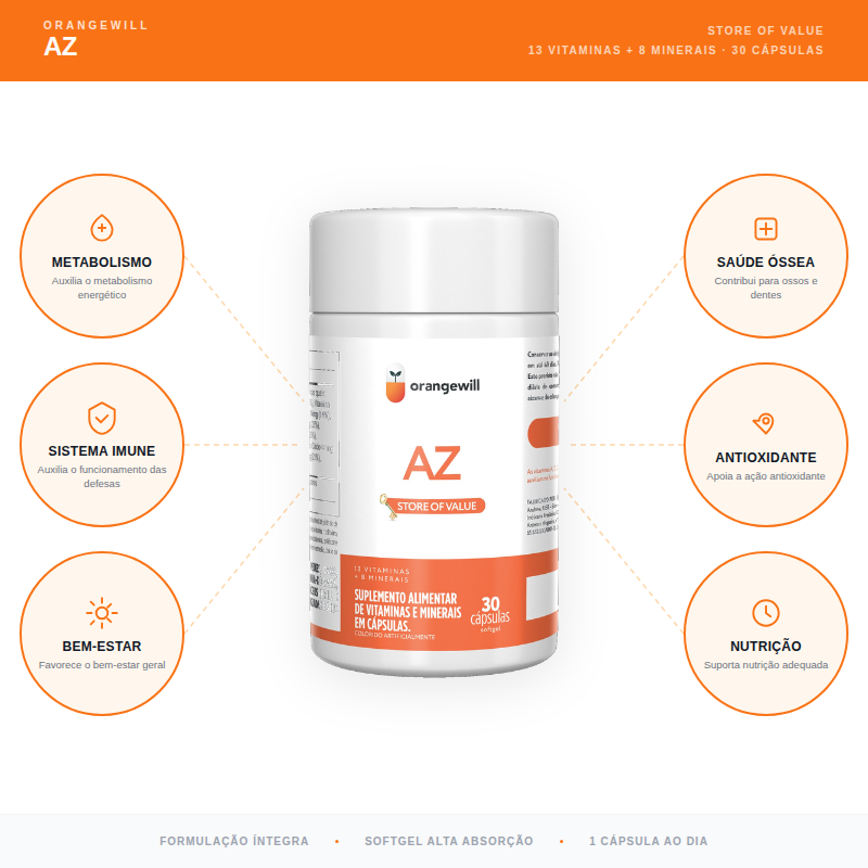 O AZ reúne um conjunto abrangente de nutrientes em cápsulas softgel de alta biodisponibilidade, fáceis de tomar e pensadas para favorecer a absorção, apoiando o funcionamento adequado do organismo ao longo do dia.