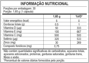 Ingredientes: Ácido ascórbico, óleo de girassol, acetato de DL-alfa-tocoferol, água purificada, óxido de zinco, selenito de sódio, extrato de própolis, colecalciferol, gelificante gelatina, umectante glicerol, emulsificante lecitina, estabilizante cera de abelha e corantes óxido de ferro preto e óxido de ferro vermelho.