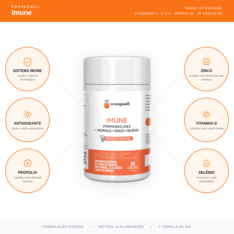 O Imune reúne própolis, vitamina C, vitamina D, zinco e vitamina A em cápsulas softgel de alta biodisponibilidade, que facilitam a ingestão e favorecem a absorção, apoiando o funcionamento adequado das defesas naturais do organismo.