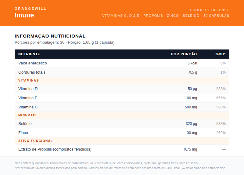O IMUNE oferece alto teor de vitamina C e zinco, além de ser fonte de vitaminas D e E, contribuindo para o funcionamento adequado do sistema imune e para a proteção das células contra o estresse oxidativo.